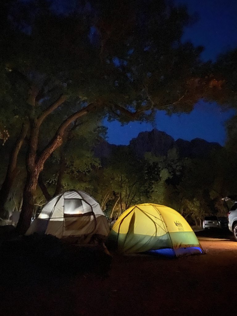Last time, because it was so cold, we couldn’t camp and stayed at an Airbnb nearby, but the weather this time around in early October was perfect for us to camp two nights in Zion. We stayed at the South Campground (one of two open because of Covid), which had lovely views of the Watchman and was next to the Pa’rus Trail where we went on a nice post-dinner walk.