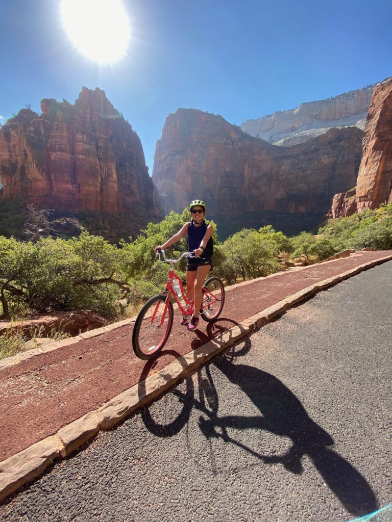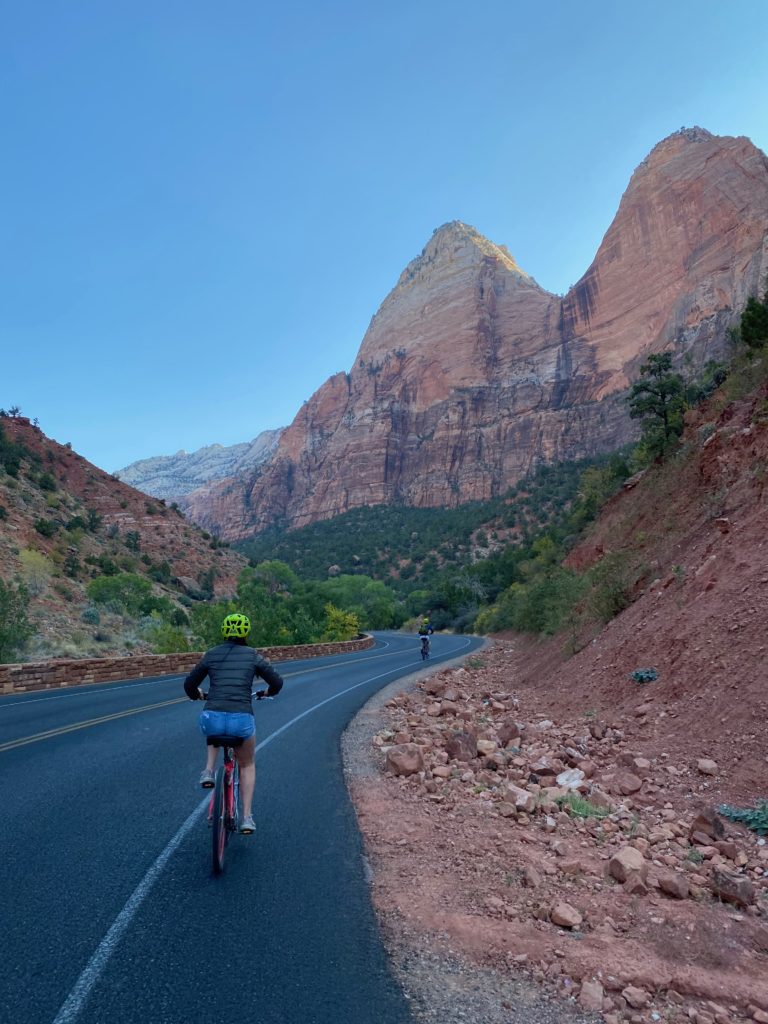 We probably biked a total of just under 20 miles (it’s about 15 miles out to The Narrows which is the end of the Scenic Drive and back). It’s slightly uphill on the way in but mostly downhill on the way back. You can also put your bike on the shuttle at any point if you get tired, but we had a really great time just biking the whole way in and out.